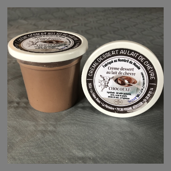 Ingrédients : Lait de chèvre pasteurisé – Sucre – Cacao en poudre – Texturant (amidon de maïs, carraghénane)