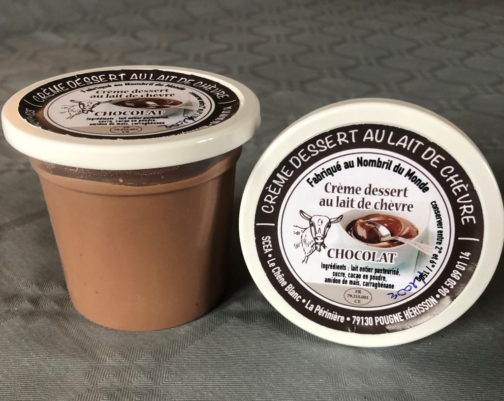 Ingrédients : Lait entier pasteurisé de chèvre – sucre – amidon de maïs – cacao maigre – stabilisant (carraghénane)
